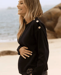 Doté d’un ruban en panne de velours ainsi que de jolis boutons dorés sur les épaules, le pull marin Molène est très tendance et particulièrement confortable. Vous pourrez le porter longtemps après grossesse.