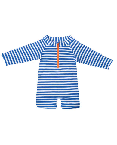 La combinaison de bain bébé Belle Ile est le maillot de bain idéal pour votre bébé. Avec ses manches longues et sa coupe short il le protégera du soleil tout en lui assurant du confort avec sa matière effet velours.
