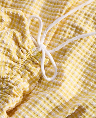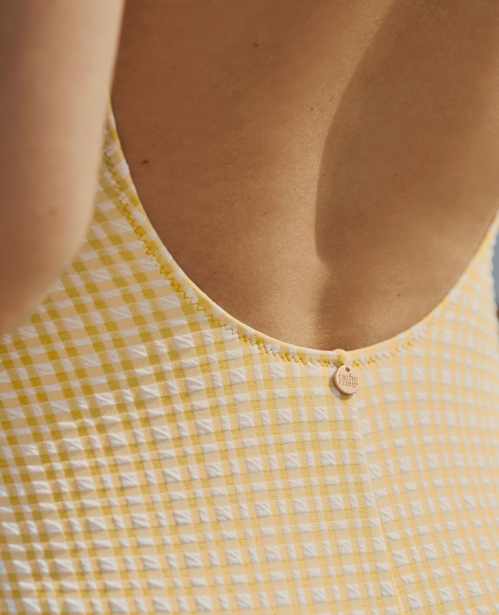 Retour aux années retro avec le maillot de bain de maternité Marty, le parfait équilibre entre nostalgie et modernité. Avec son motif vichy jaune et sa matière texturée, il est à la fois chic et très agréable au toucher.