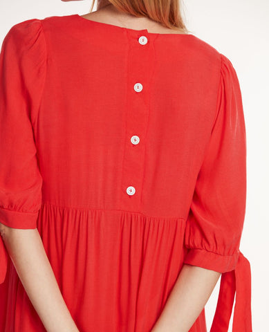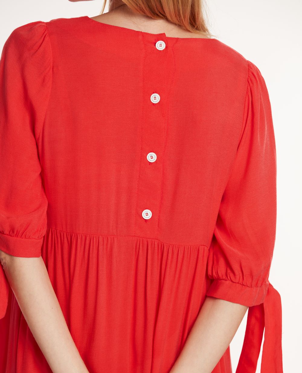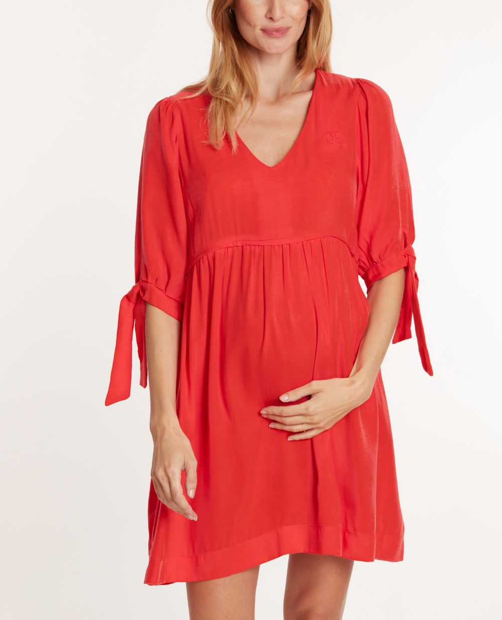 Pratique grâce à son zip invisible et tendance avec sa coupe baby doll oversize, son décolleté en v et ses manches ballons qui lui confèrent un charme supplémentaire. Son détail brodé œ, ses nœuds au bout des manches et ses jolis boutons dans le dos agrémentent cette robe courte de maternité idéale pour la saison Printemps-Eté.