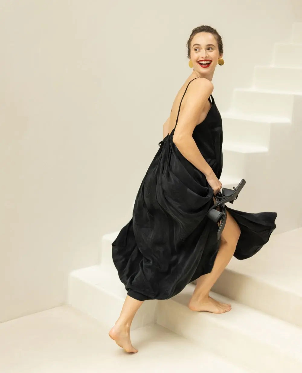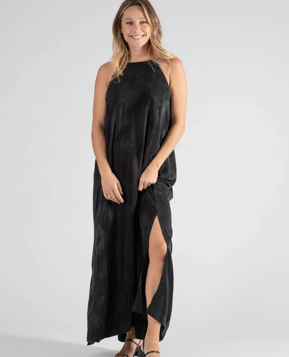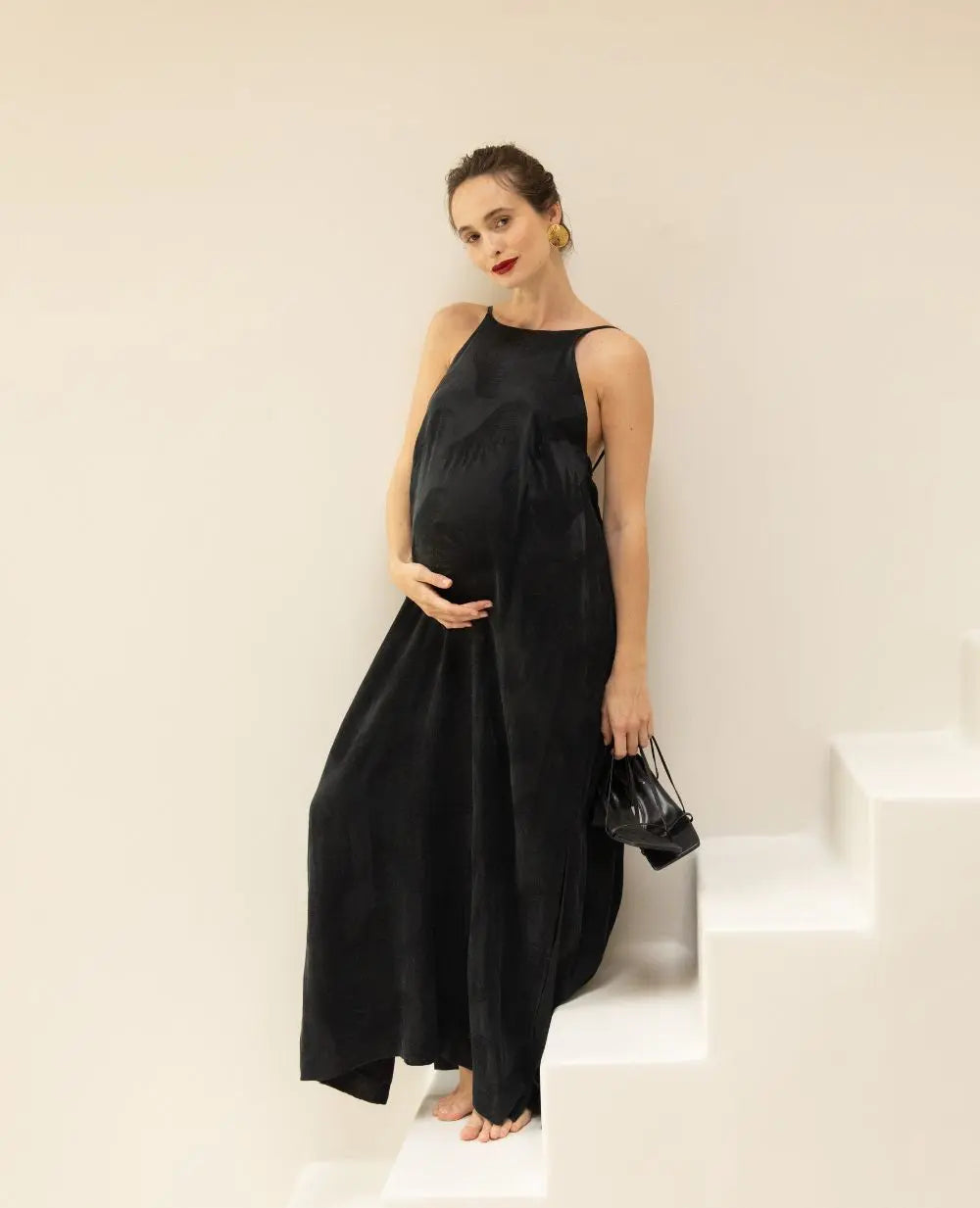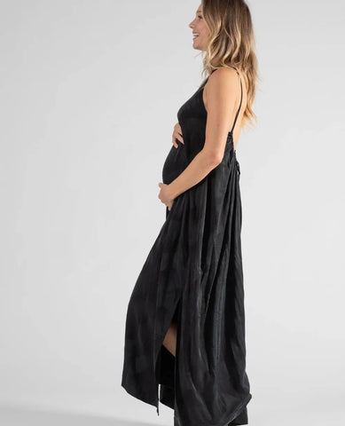 Belle de jour comme de nuit avec la robe longue de grossesse et d’allaitement Isis. De coloris noir, avec son tissage jacquard, elle s’adapte à toutes les occasions. Sa matière légère et fluide la rend parfaite à porter en journée quand son dos nu et ses fentes aux jambes lui confèrent un petit charme habillé idéal pour les soirées.