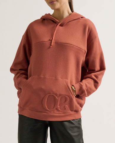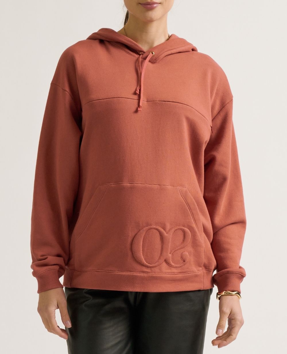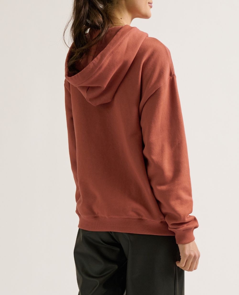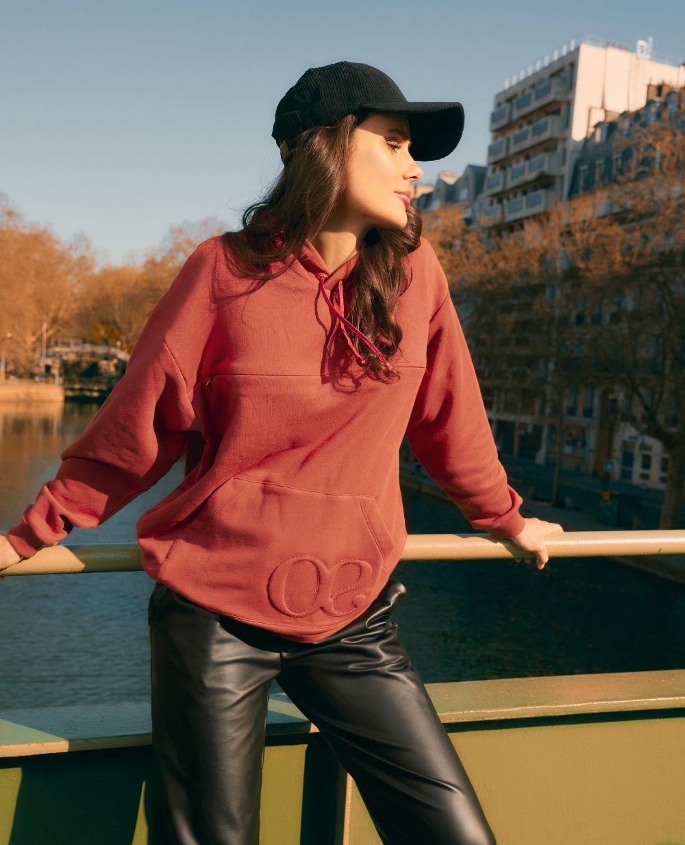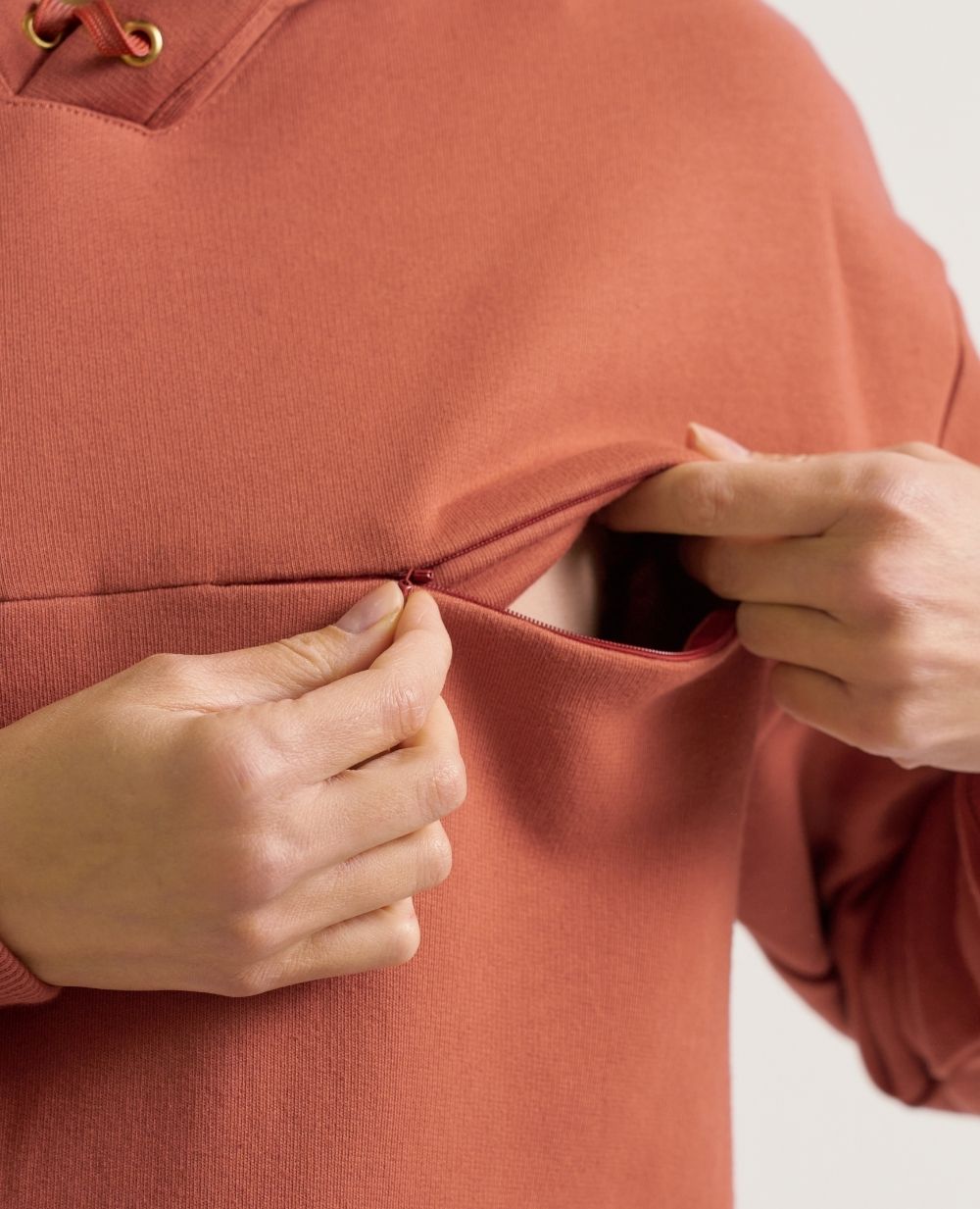 • Sweat à capuche terracotta : un basique revisité, facile à porter pendant et après la grossesse.