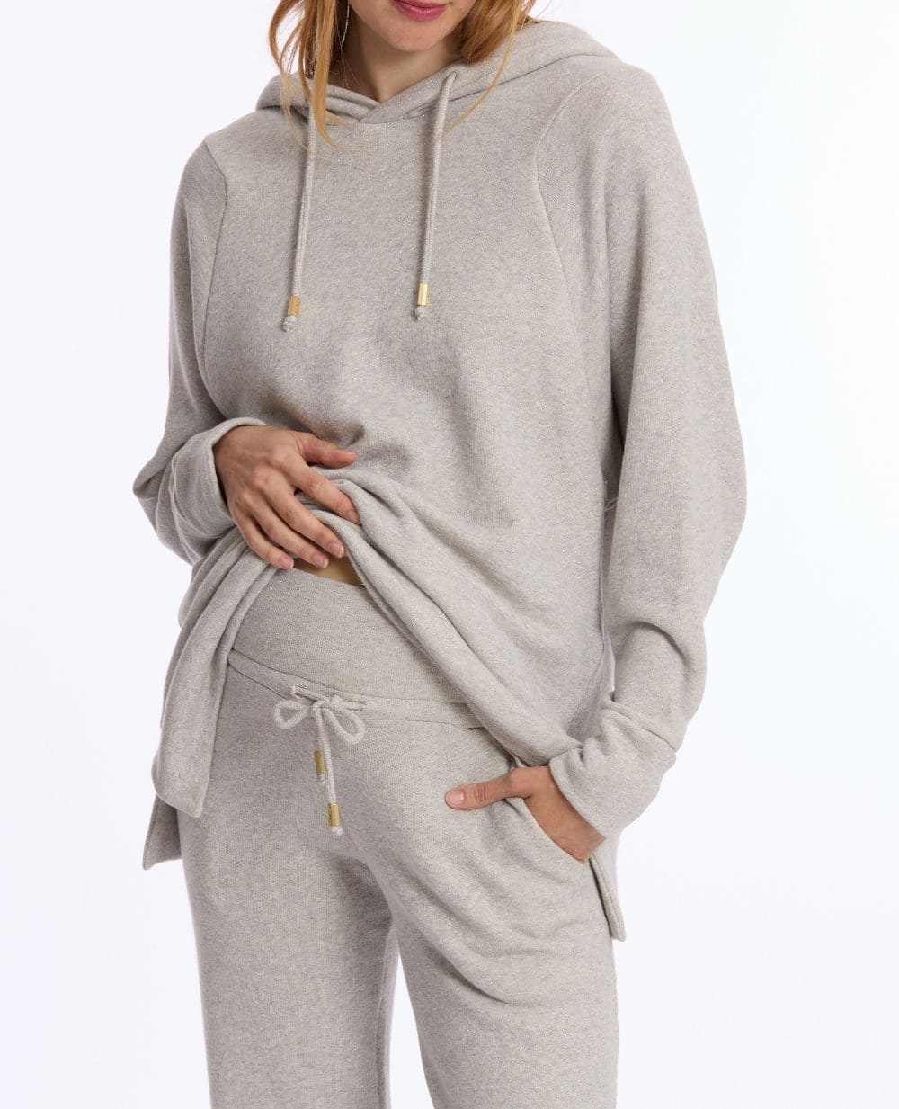 Le sweat de grossesse et d’allaitement Billie a tout pour vous séduire. Véritable sweat homewear, il est équipé d'une capuche, de cordons ajustables, de manches longues et d'une coupe oversize. Une matière pailletée et de jolies finitions Cache Cœur complètent ce haut de maternité.