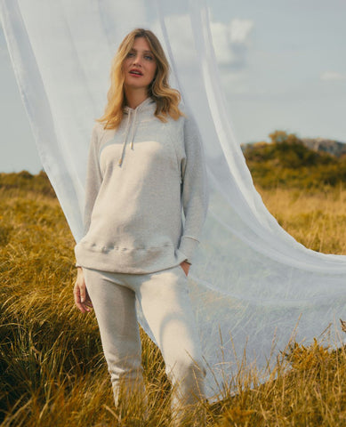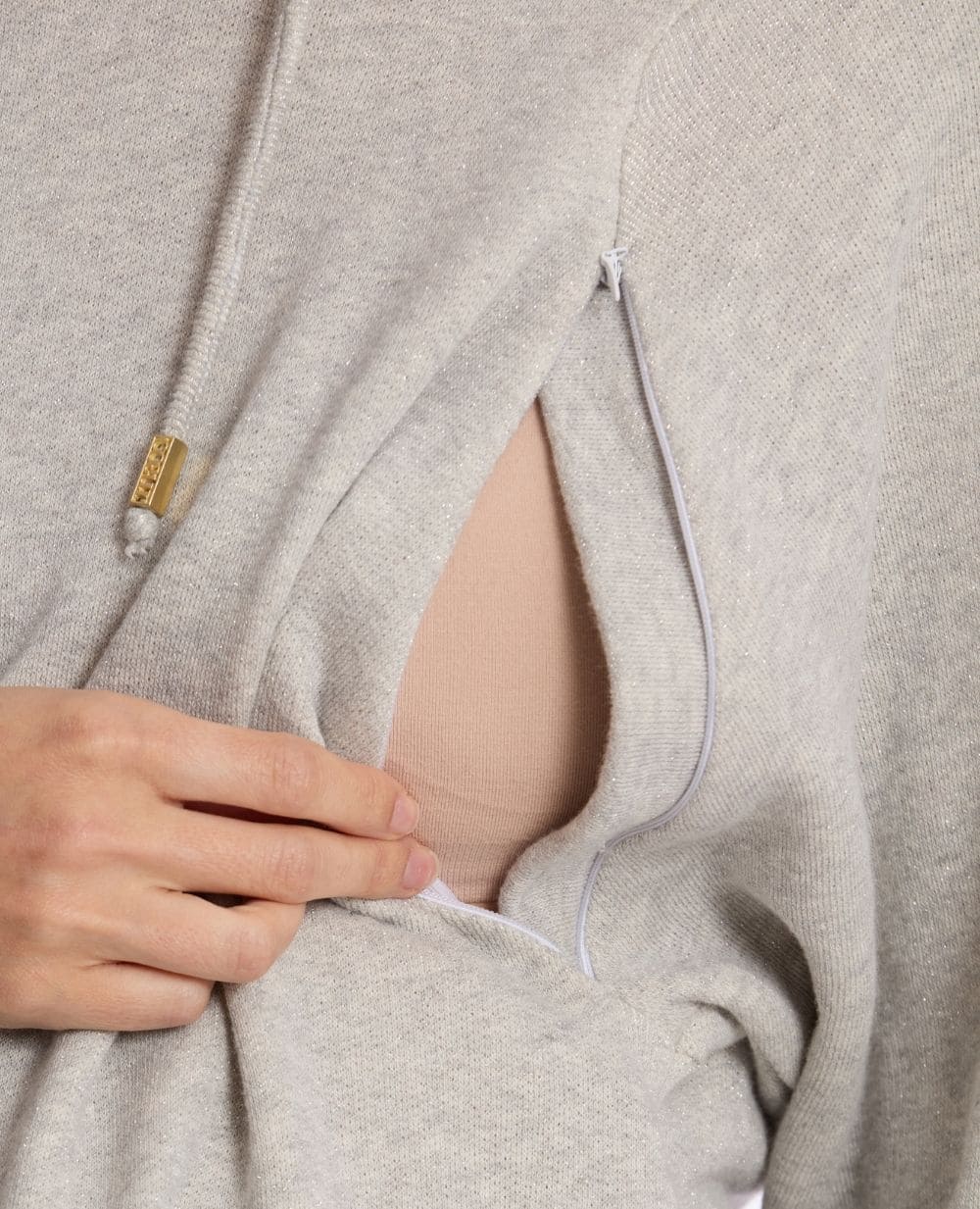 Billie, la ligne homewear brillante en coton biologique ! Craquez pour les paillettes du sweat à capuche de maternité. Un haut parfait pour la grossesse mais aussi l’allaitement avec ses deux zips invisibles présents à l’emmanchure qui vous permettent d’accéder à votre poitrine facilement.