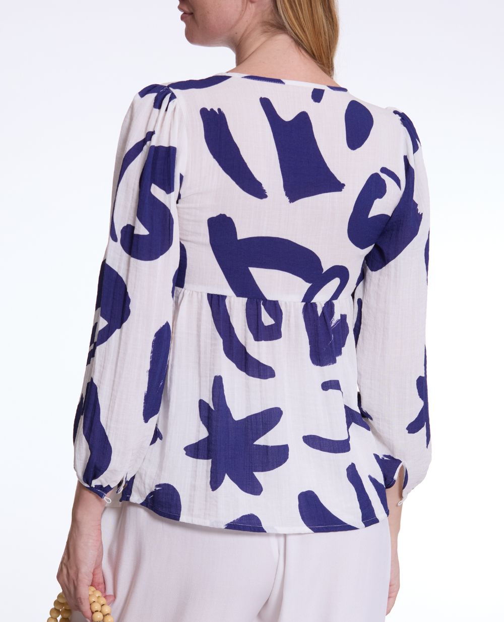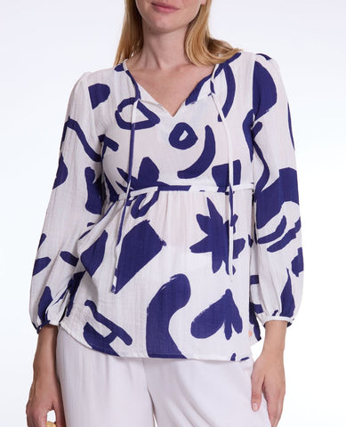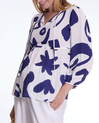 Avec son motif inspiré des îles grecques, la blouse de maternité Corfou est à la fois confortable et pratique, idéale pour la grossesse et l’allaitement avec sa coupe évasée et son accès allaitement.