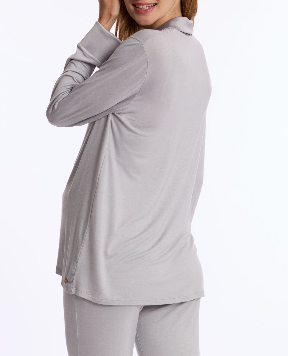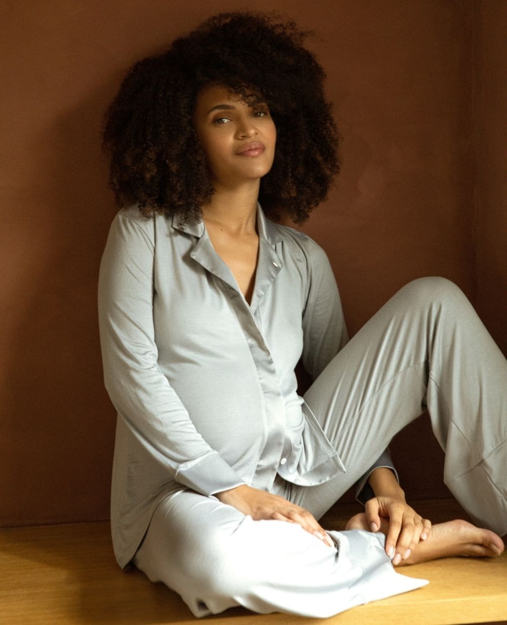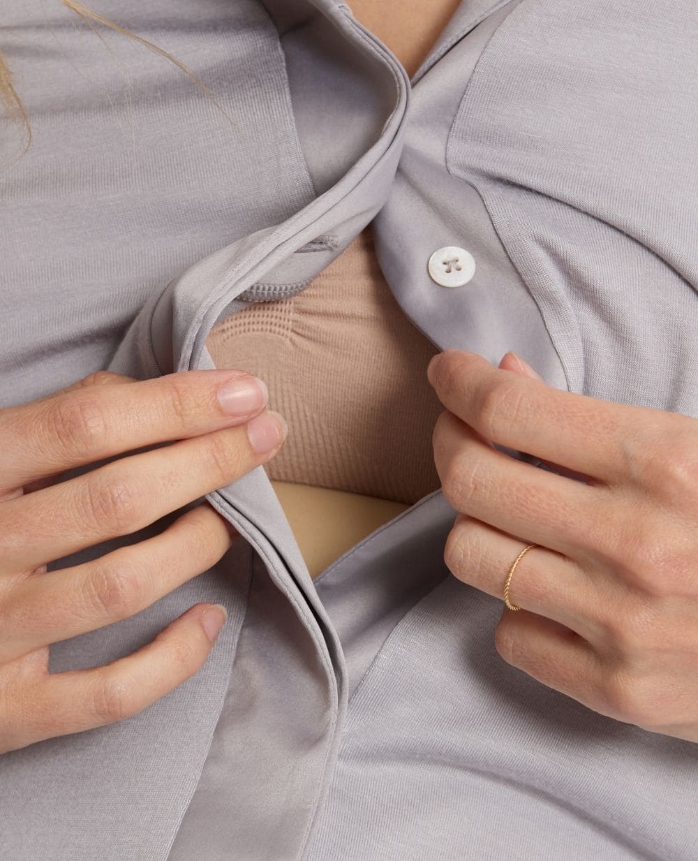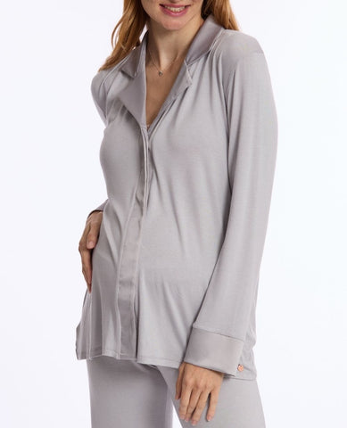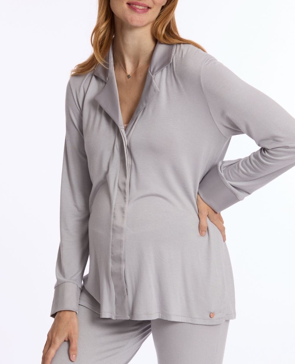 The Satine Grey Maternity and Nursing Pyjama Jacket combines softness and elegance thanks to its French bamboo viscose and satin inserts.