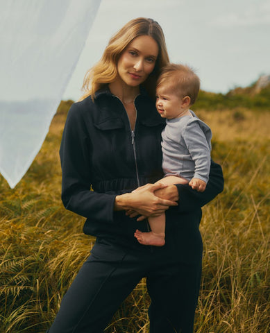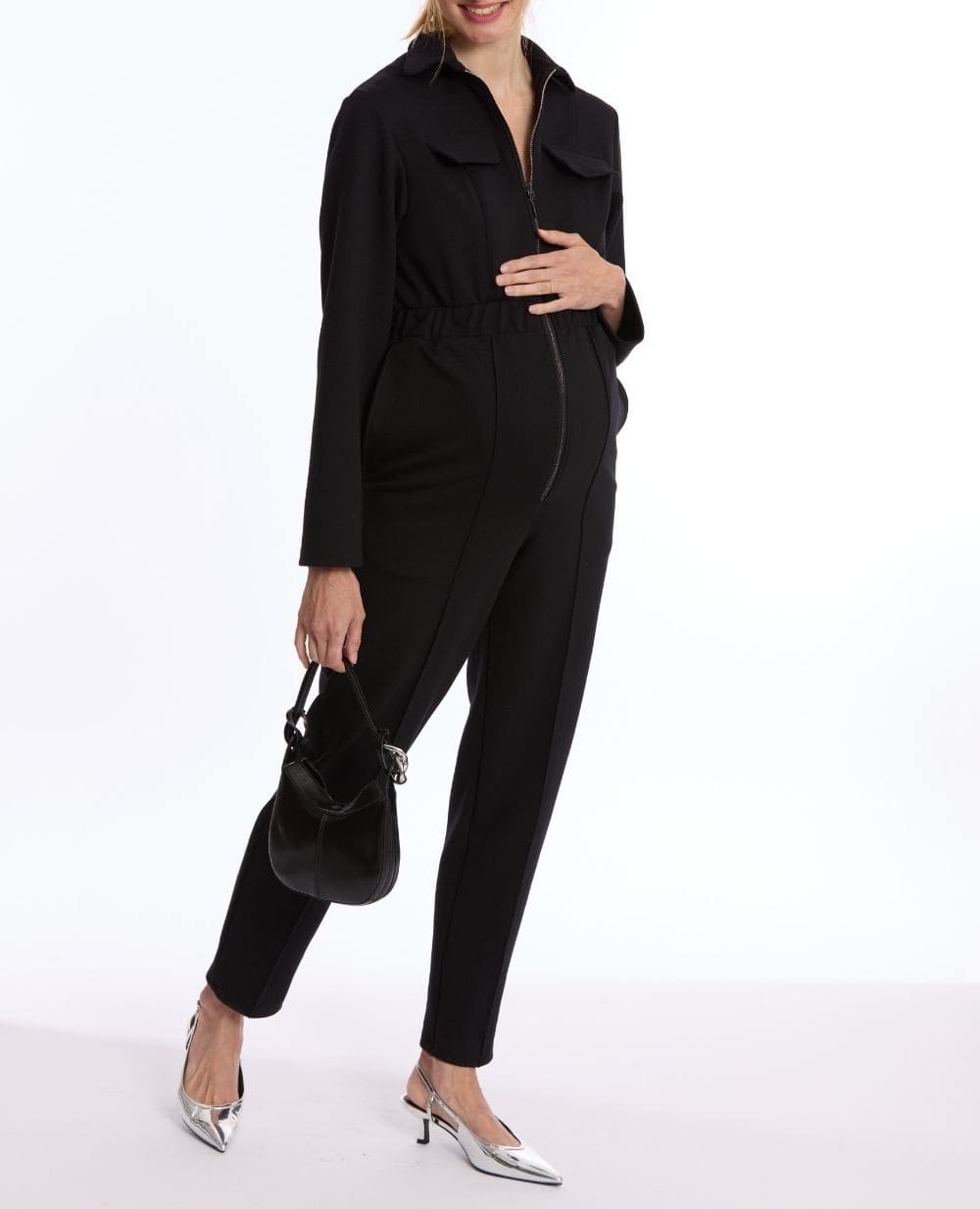 Pablo, the interlock knit maternity jumpsuit. Soft and flexible, it ensures great comfort throughout pregnancy. Its practical side: invisible zips at the chest level allow you to breastfeed easily and with peace of mind.