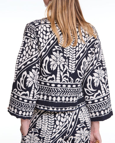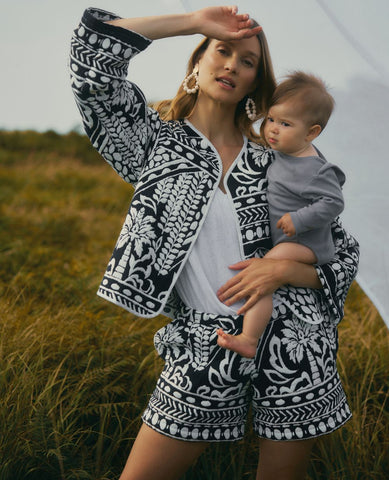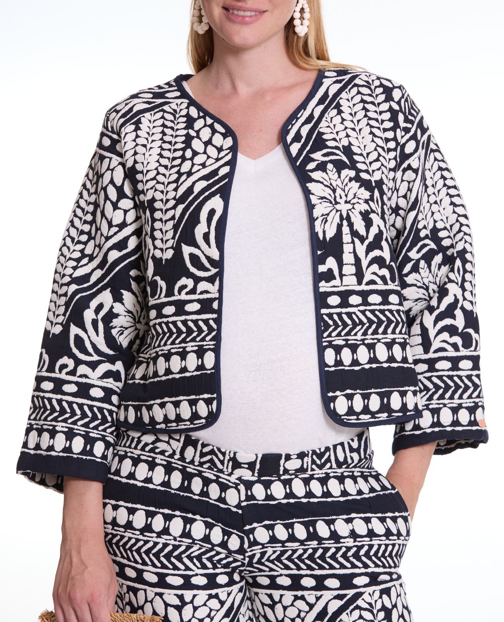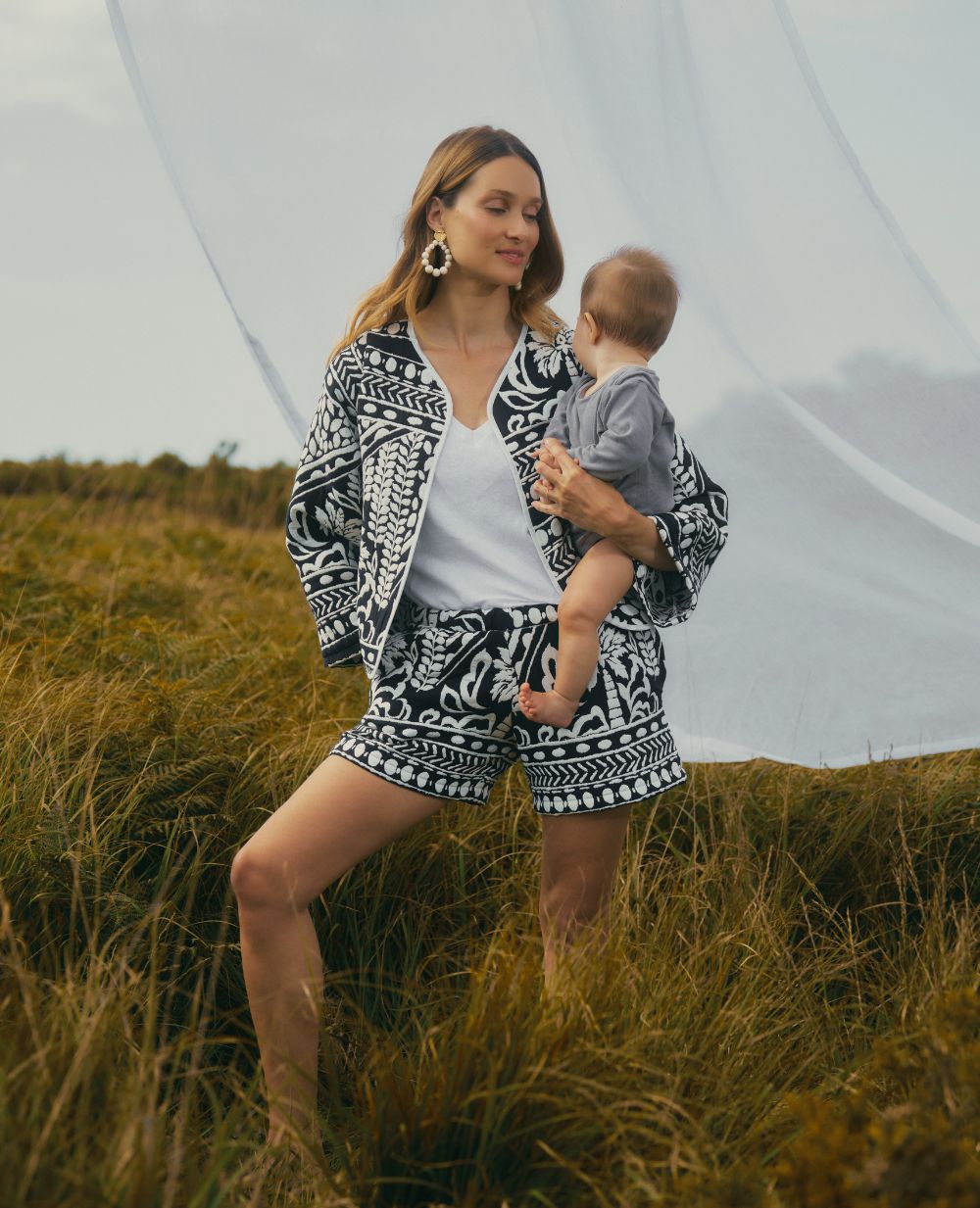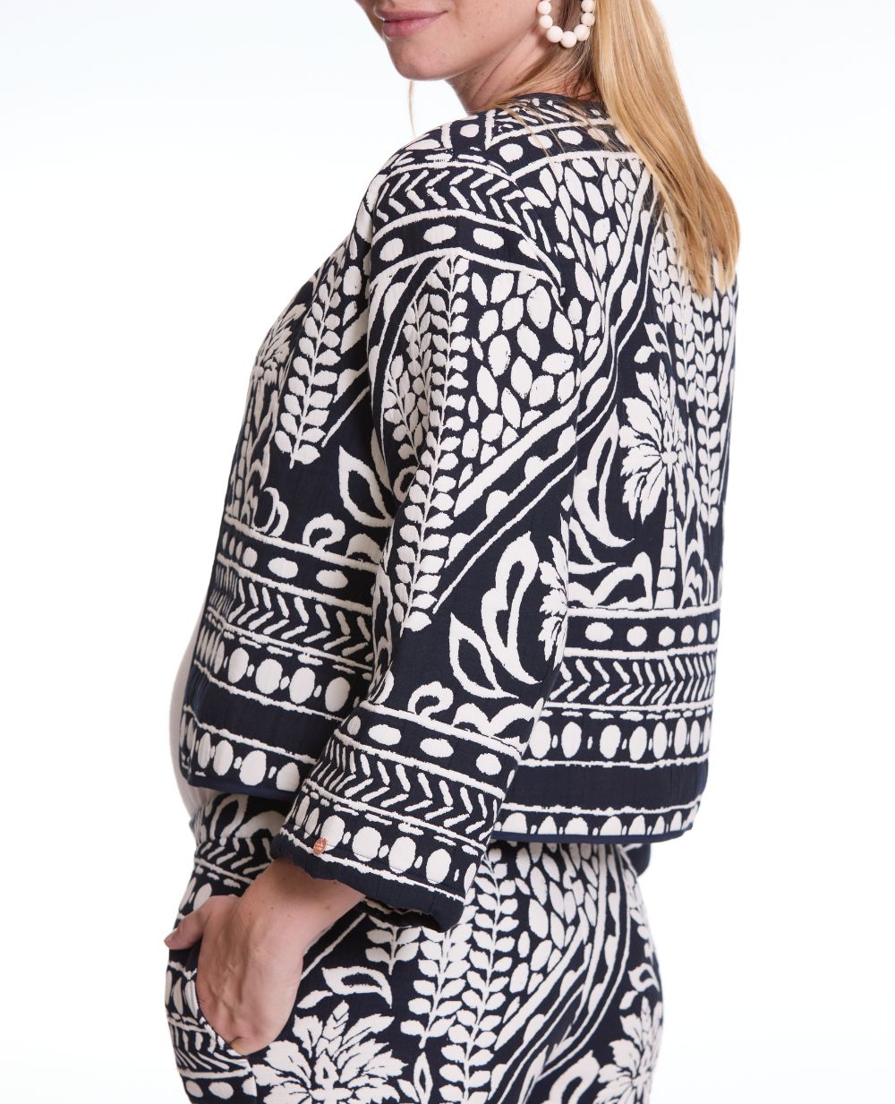 With its ethnic-inspired pattern and French jacquard fabric, the Java maternity jacket is a must-have for the summer season. Worn open, it enhances your silhouette while adapting perfectly to your body during pregnancy and after.