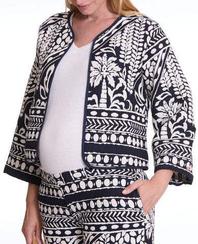 The Java maternity jacket, chic and lightweight, is perfect for summer. Its French jacquard pattern and maternity-friendly cut enhance your silhouette during and after pregnancy.