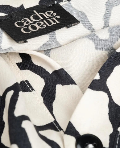 We set our sights on this silky, printed and absolutely retro-chic model: a fluid cut for pregnancy, long, slightly puffed sleeves, buttoned cuffs.