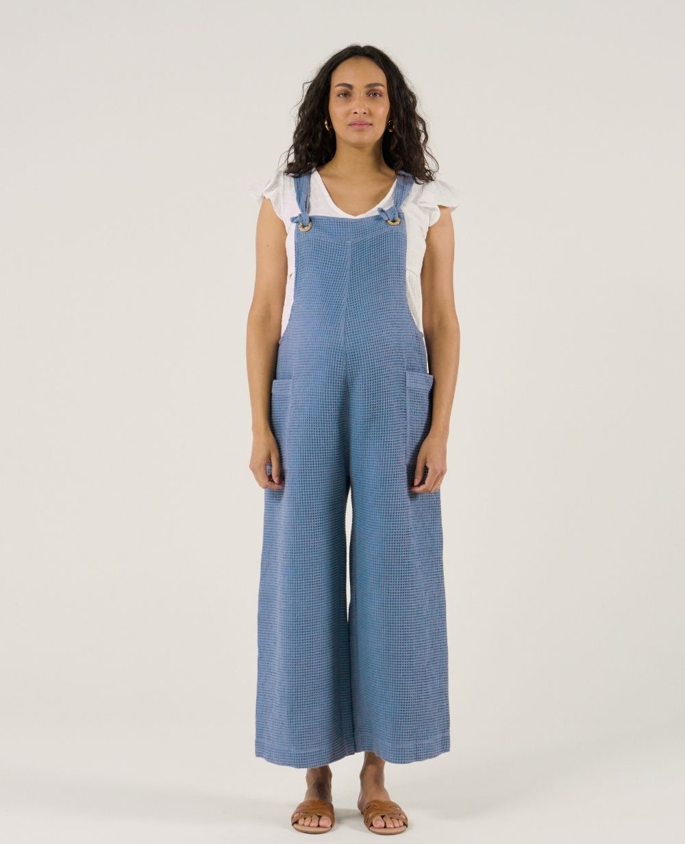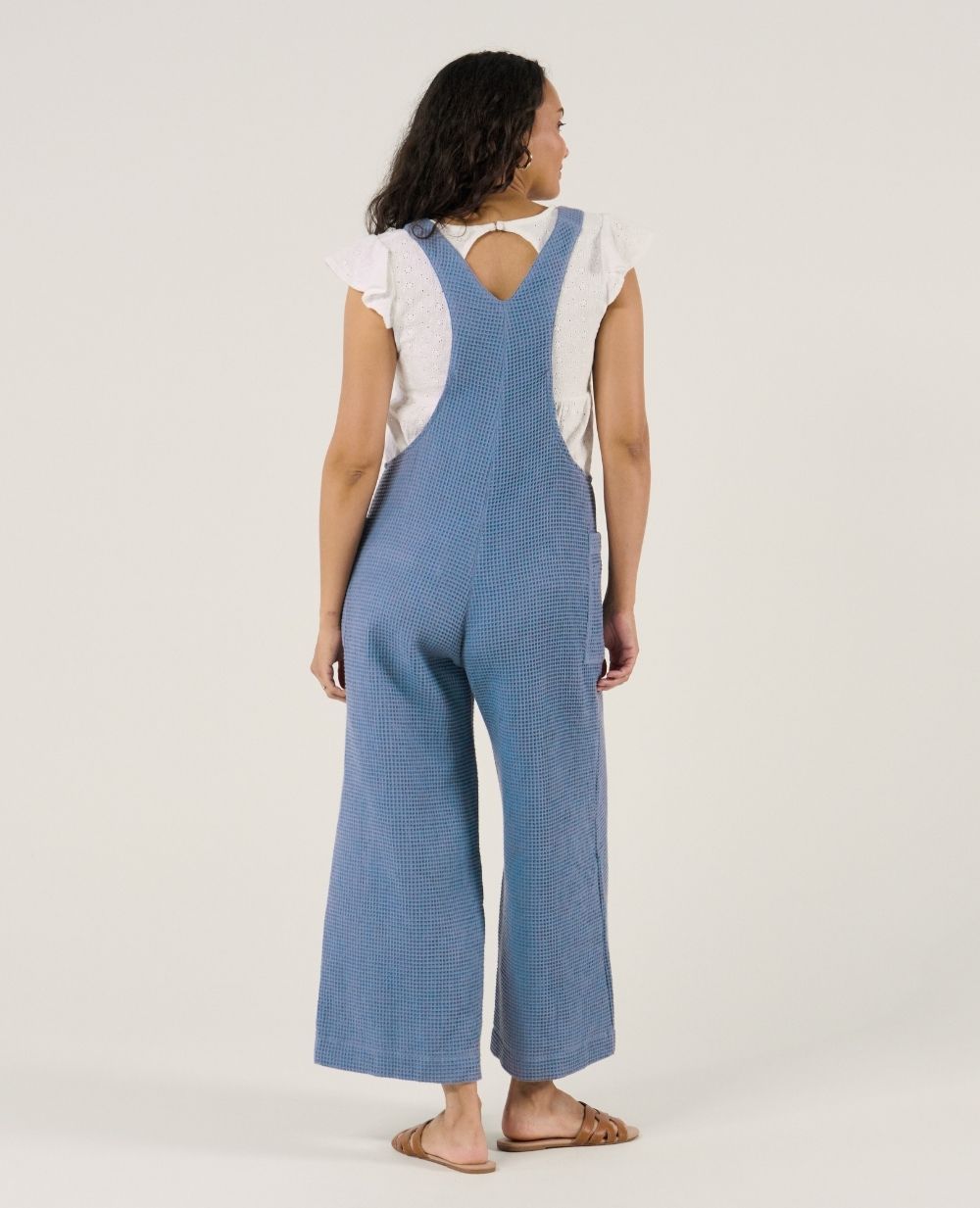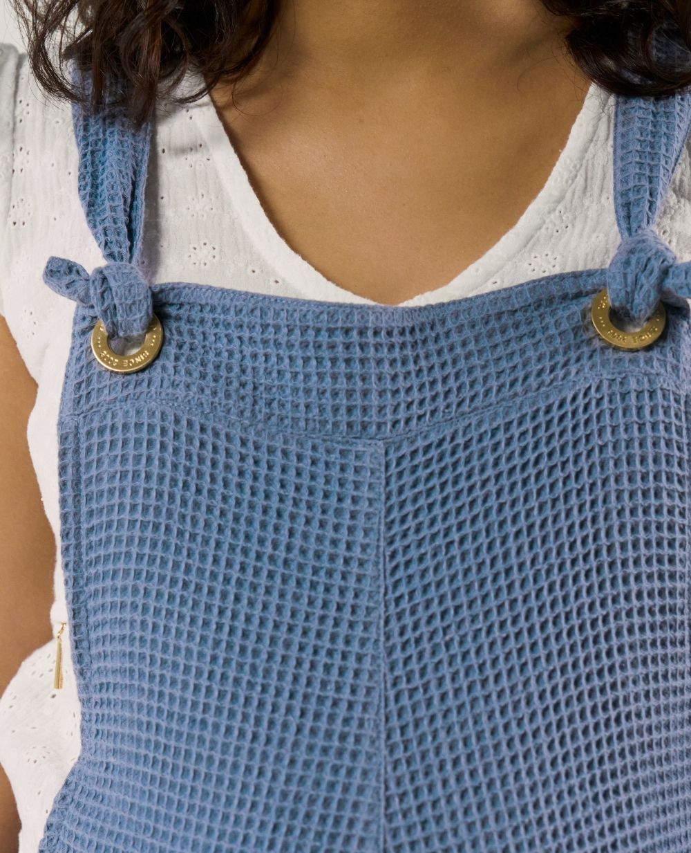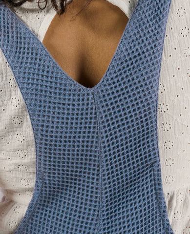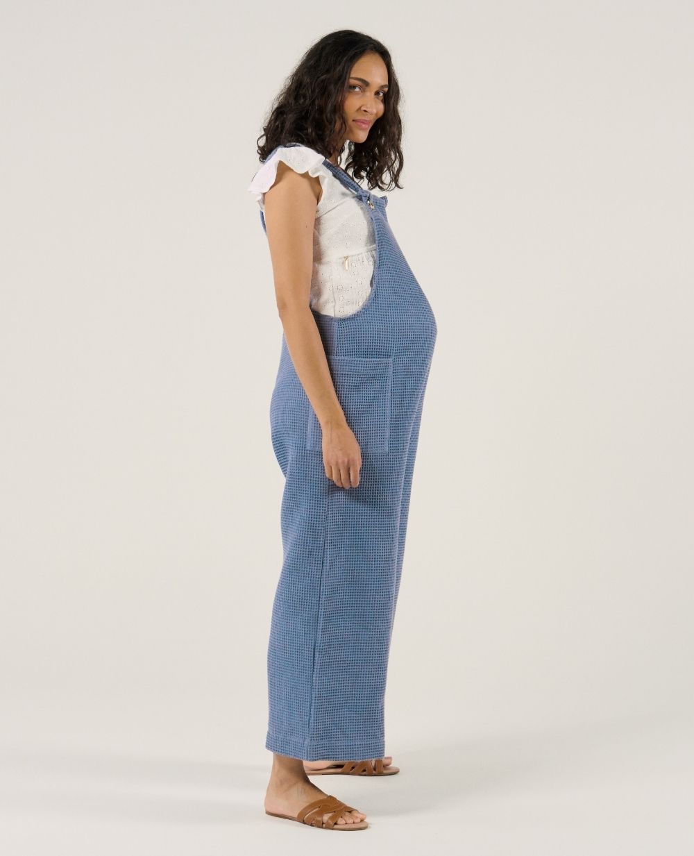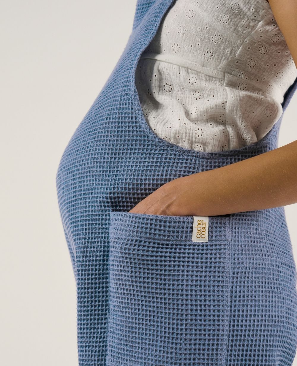 The Maya Blue maternity and nursing overalls combine practicality and eco-responsibility thanks to their honeycomb material made of 100% GOTS-certified organic cotton.
