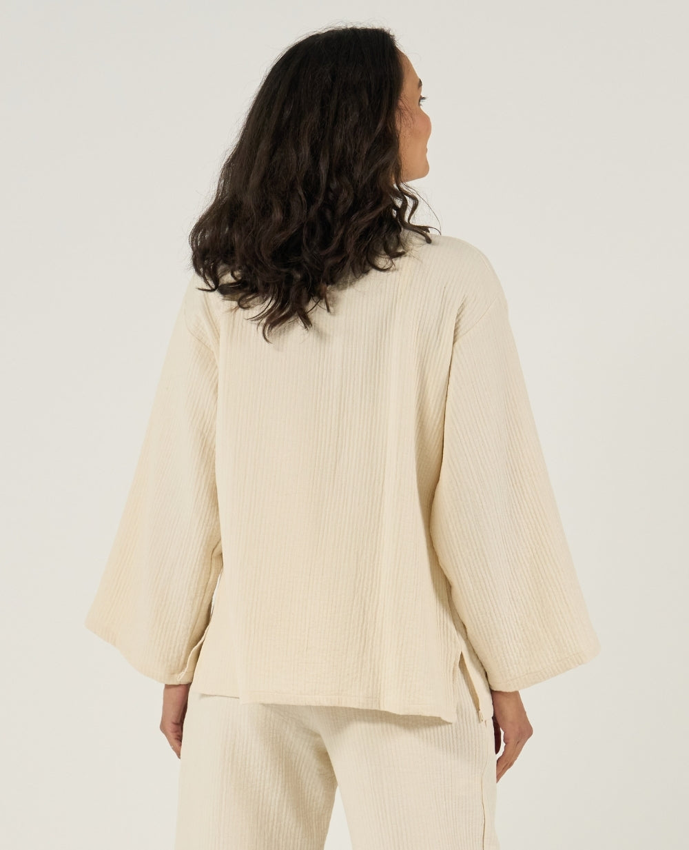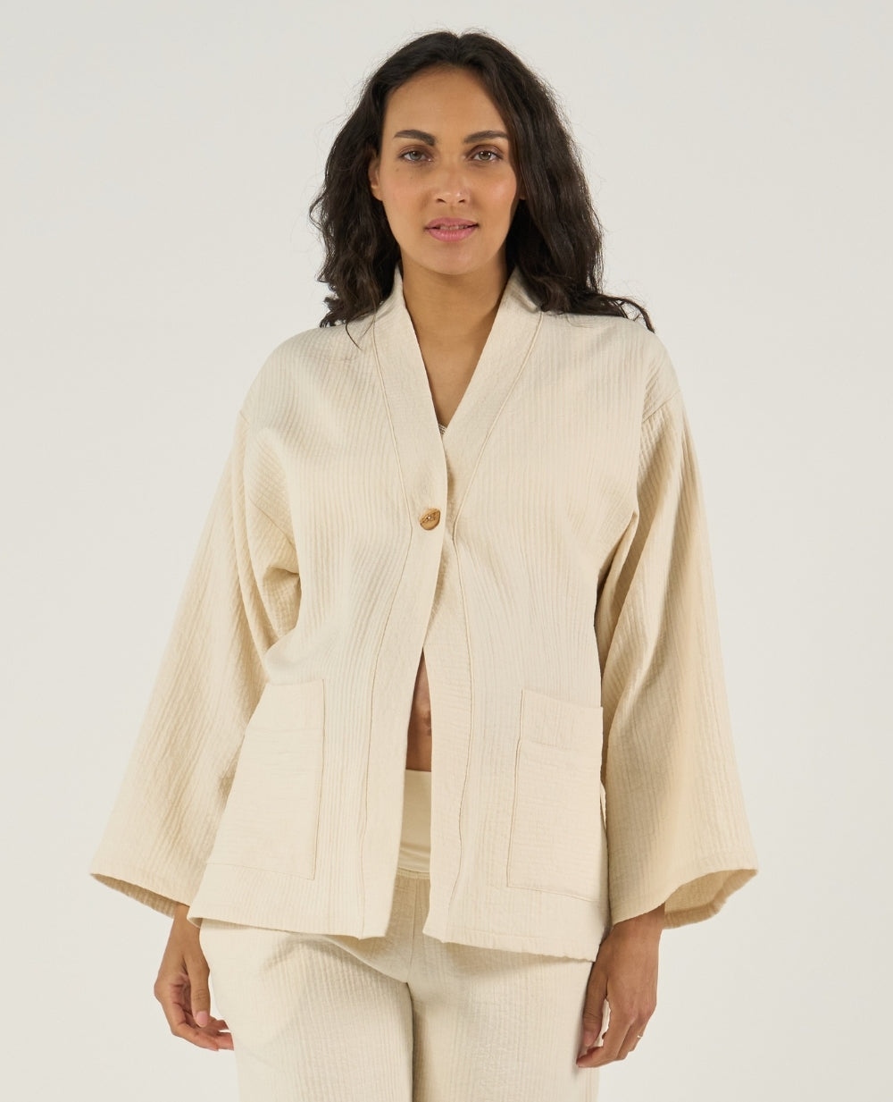 Embrace the refined elegance of the Célia kimono jacket in organic cotton, a sophisticated piece with a calm, minimalist design created to accompany pregnancy with comfort and effortless style.