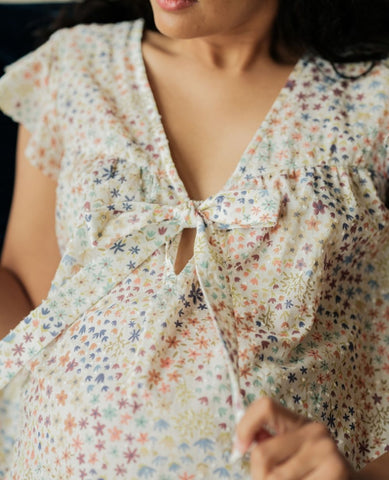 Caroline is the light, floral line that celebrates spring. This dobby voile nightdress adds a fresh, feminine touch to your maternity and nursing nights. Its ultra-soft organic cotton and delicate ruffled shoulder details create a romantic, airy silhouette, perfect for feeling both beautiful and comfortable.