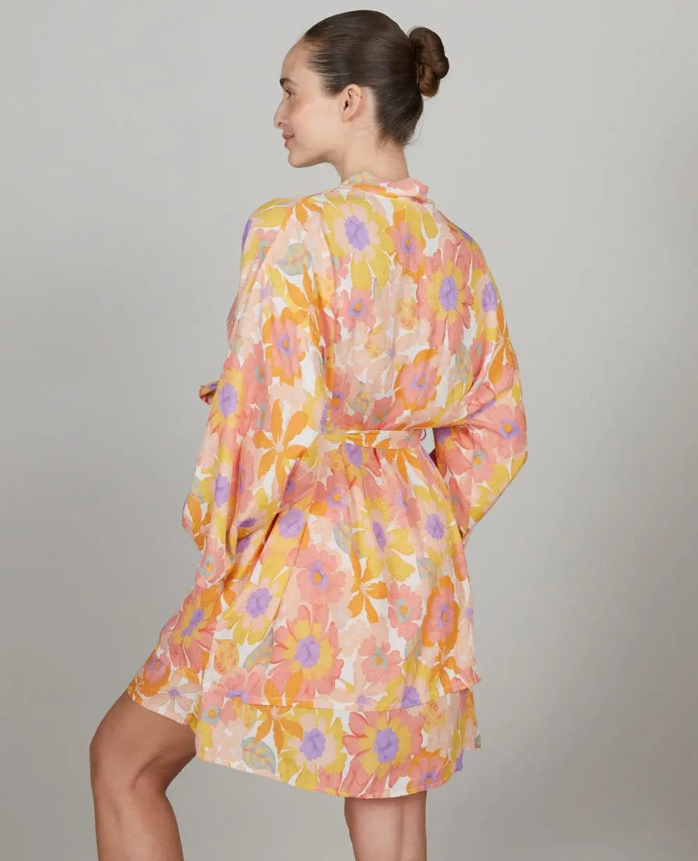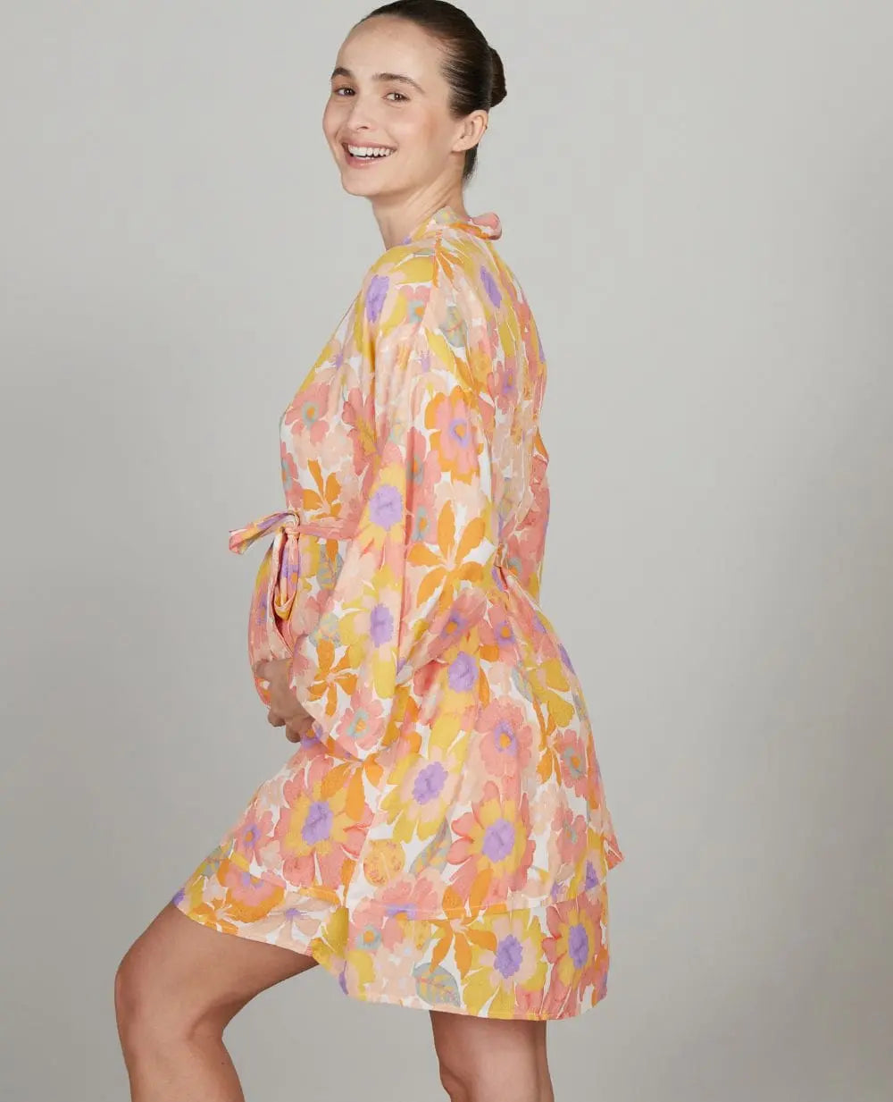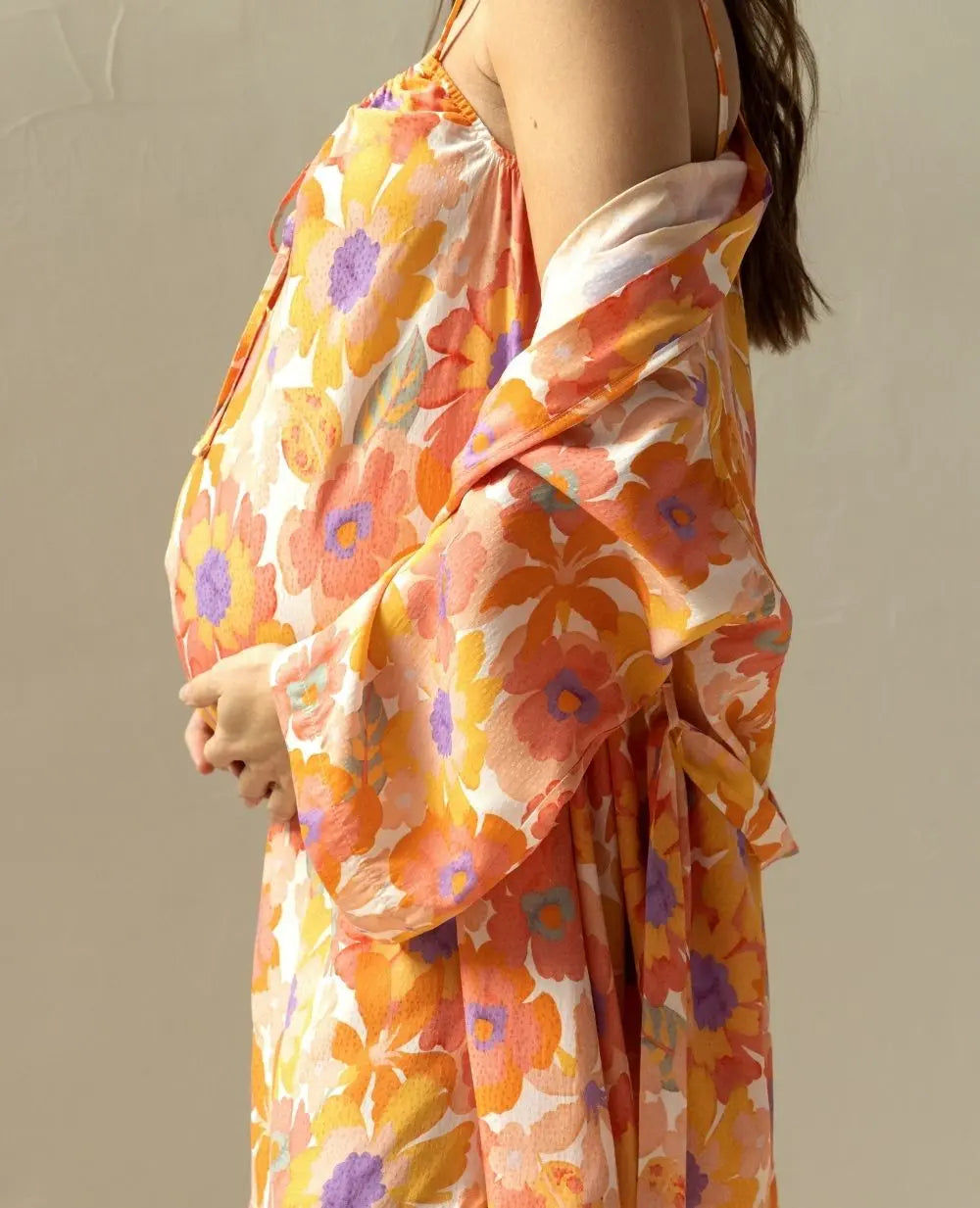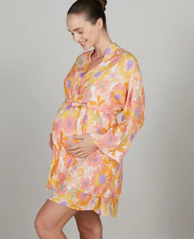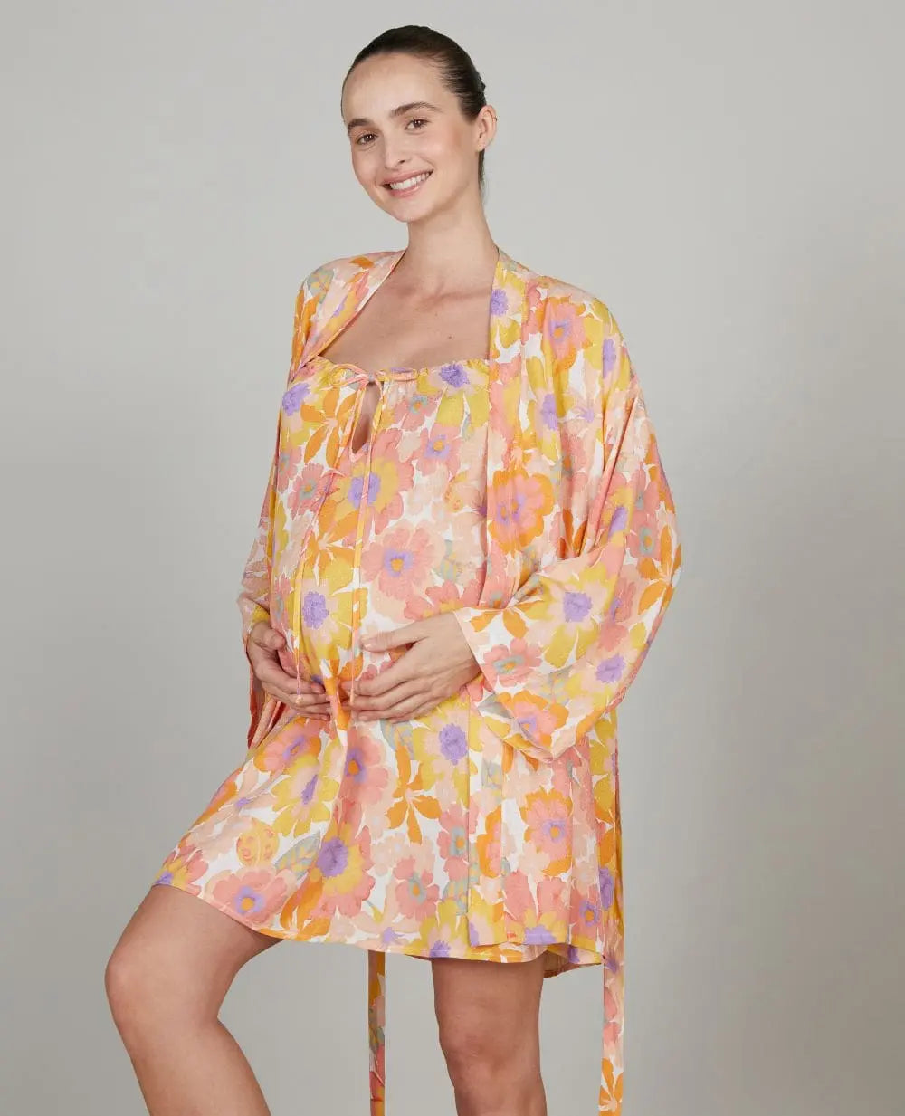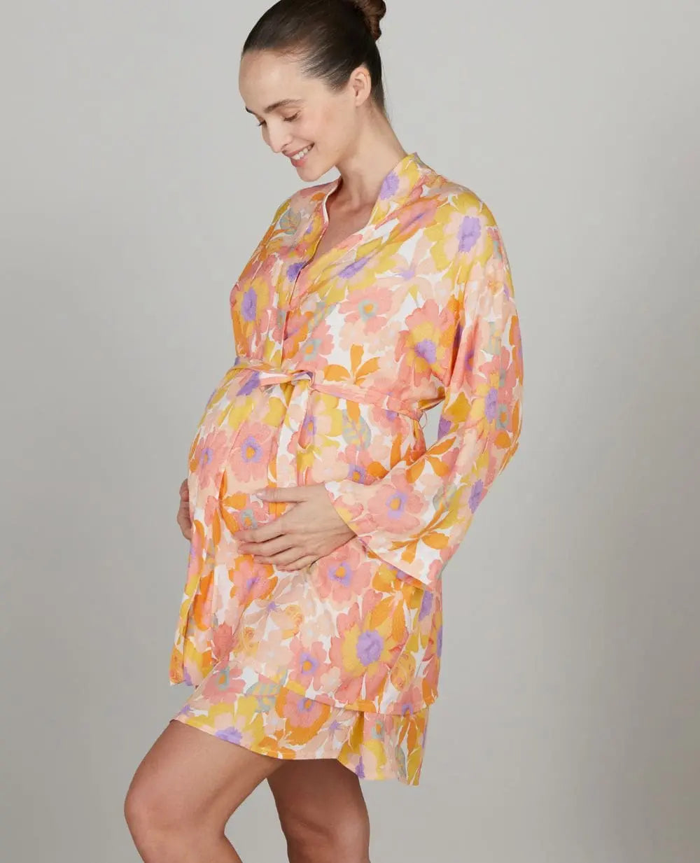 The Barbara maternity and nursing kimono will be your ally for summer nights. Made of French viscose, a light and breathable material, Barbara is a comfortable and feminine negligee with a colourful floral pattern.