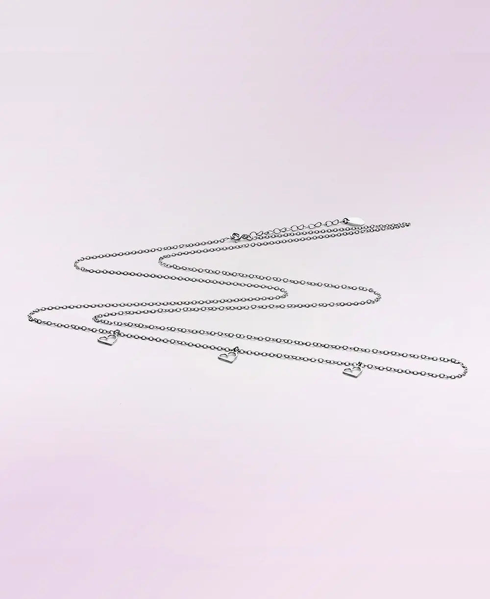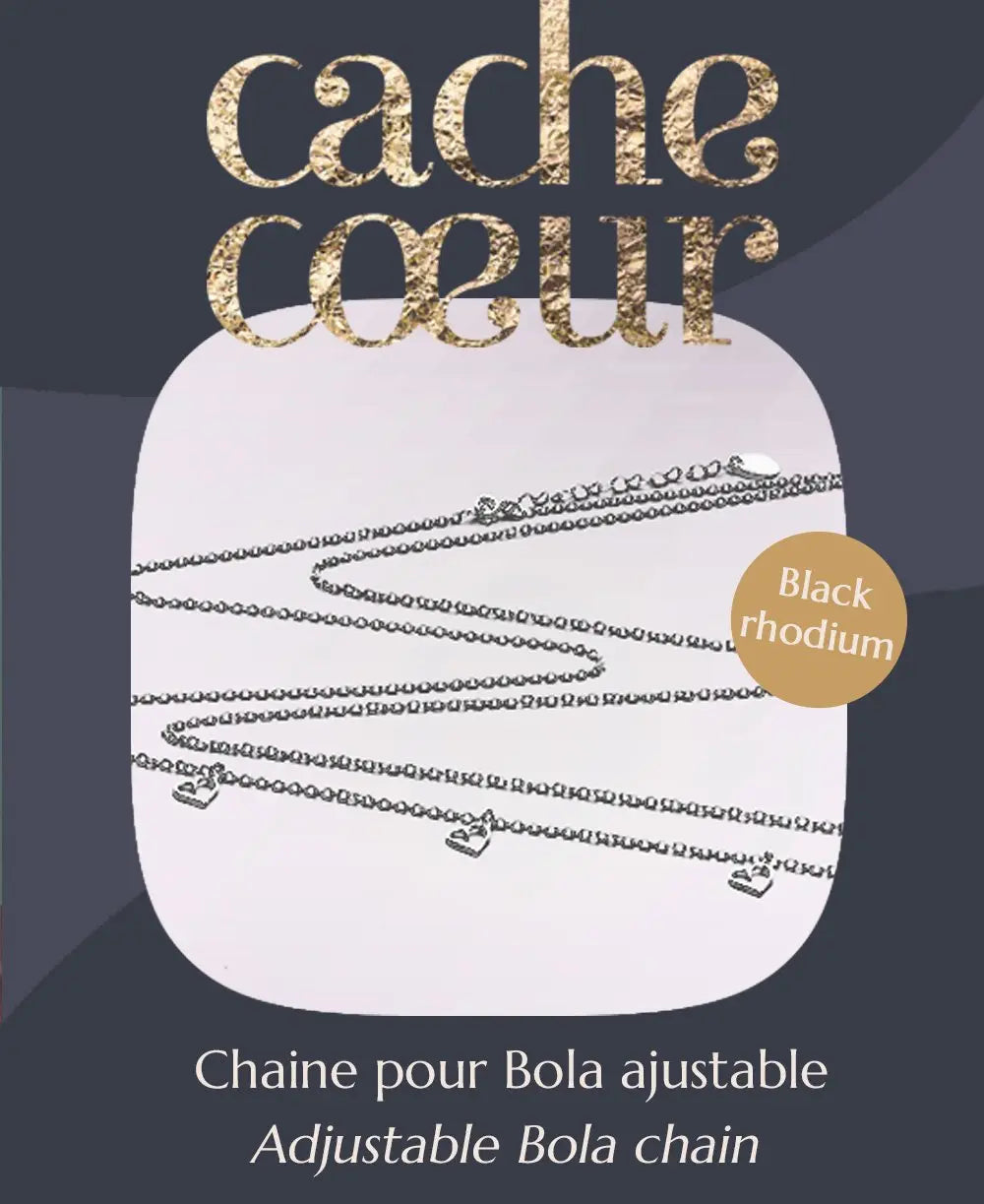 Brass chain covered with black rhodium is to be combined with a pregnancy bola to have a unique jewel. This chain has three small hearts on one side. It is 110cm long and adjustable by 10cm.