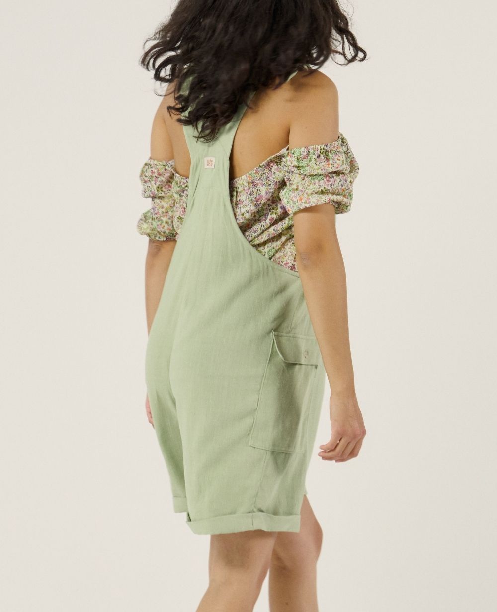 La salopette de maternité et d'allaitement Éloïse Sauge allie praticité et éco-responsabilité grâce à sa matière nid d'abeille en coton 100% biologique certifié GOTS.