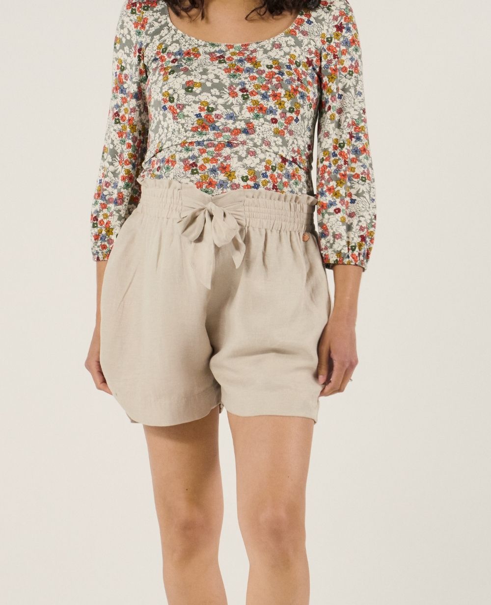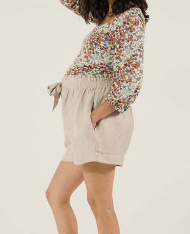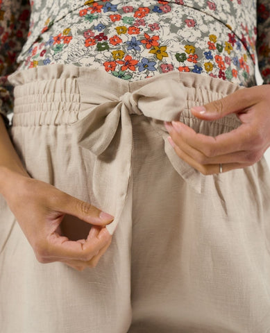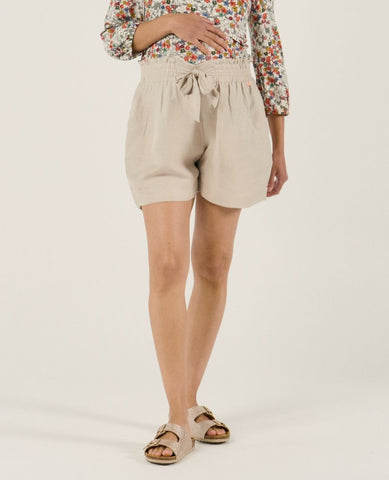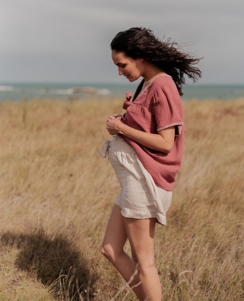 Le short de maternité Nubie Beige allie fluidité et confort grâce à sa matière twill Cupro Ecovero et sa ceinture élastiquée smockée.