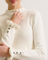 Dorothée è un maglione pensato per la maternità, con quel tocco in più di carattere che fa tutta la differenza. Il suo tessuto in viscosa morbido ed elasticizzato offre un comfort immediato, mentre le finiture delicate – colletto lavorato, bottoni in madreperla di Tahiti e polsini con volant – lo rendono un capo facile da indossare ma mai banale.