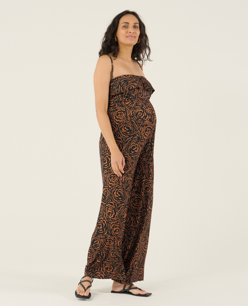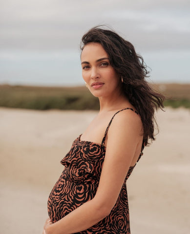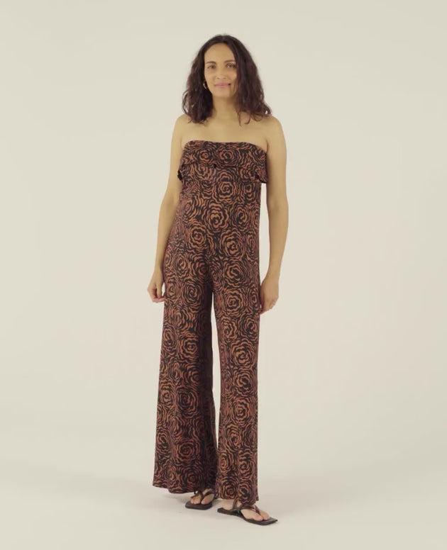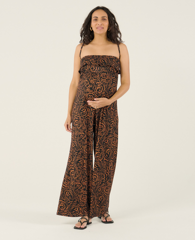 Eleganza e praticità si fondono nella Tuta premaman Irma Marrone, un capo a bustier con volant che rivisita lo stile pantalone in chiave moderna.