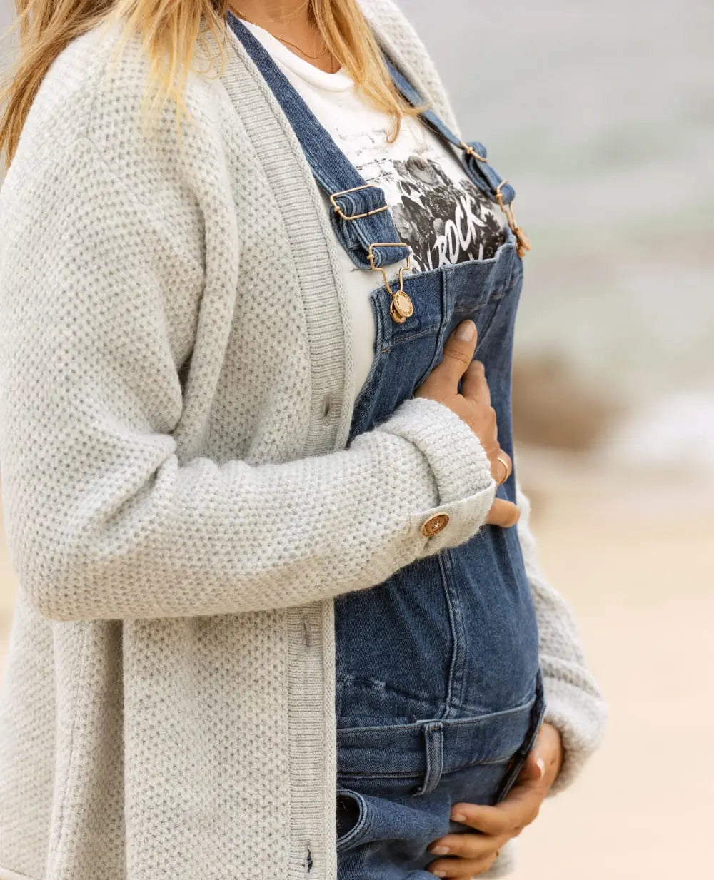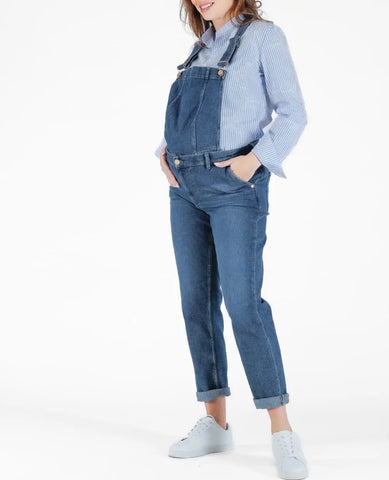 La salopette premaman in jeans Carrie Mid Blue Used combina lo stile mom fit con l'eco-responsabilità grazie al suo cotone riciclato e al sistema evolutivo Caméléon.