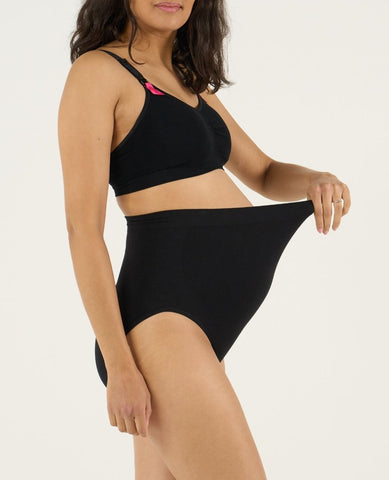 La maxi culotte de grossesse sans couture Essentiel Noir vous accompagne tout au long de votre maternité grâce à sa viscose de bambou ultra-douce et sa construction sans couture.